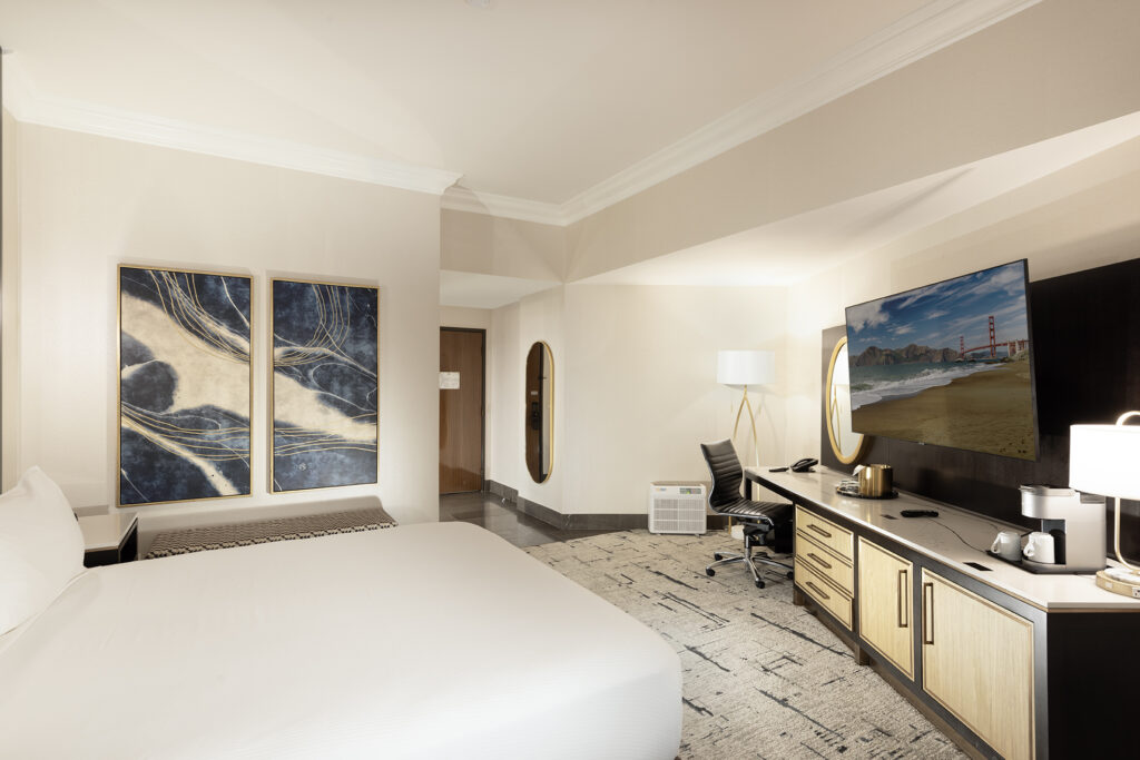 The Peppermill Tower rooms are known for their modern luxury, comfort, and elegant design, frequently voted as the best hotel rooms in Reno. Many rooms have been recently remodeled and showcase elegant design details, such as airy quartz countertops, dark birch furnishings, and stylish contemporary artwork with designer carpeting.
