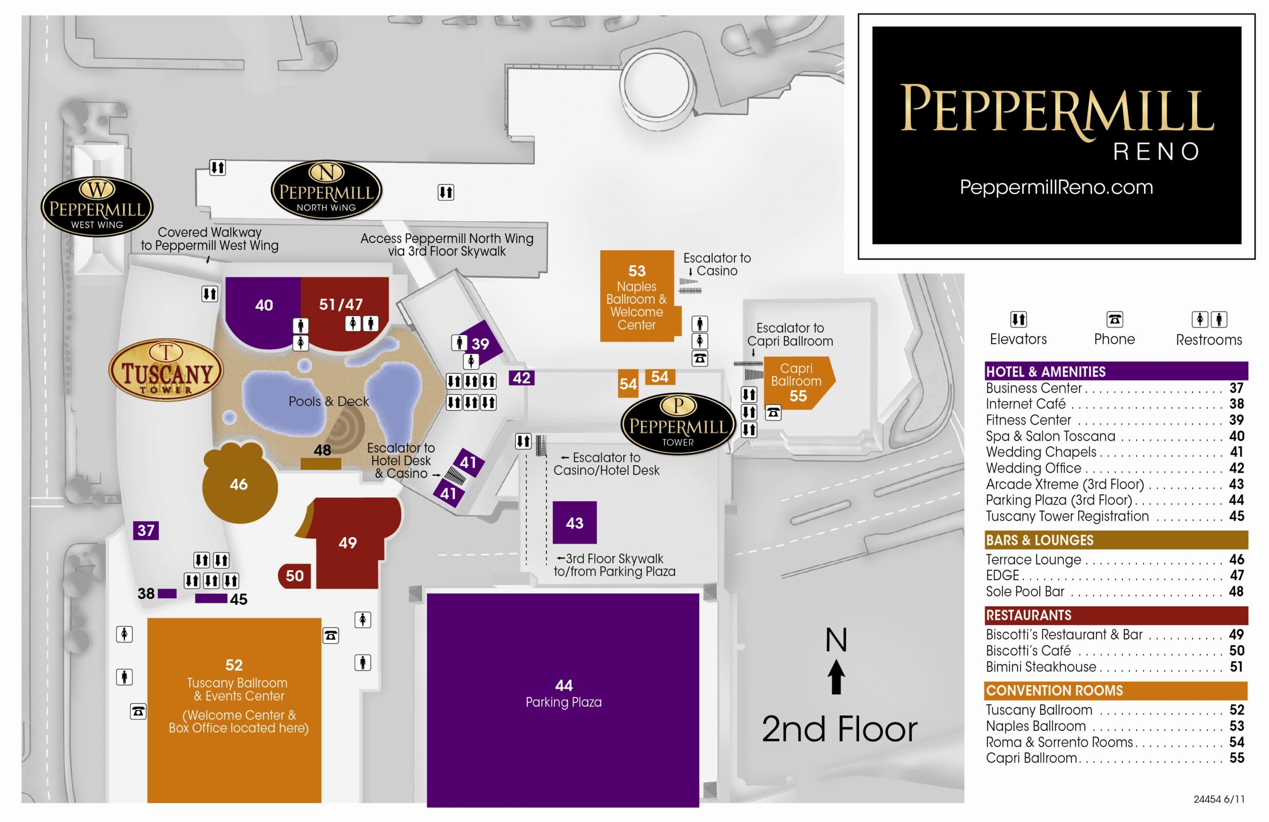 Once you register, you will be sent information on how to reserve a room in the hotel block. While planning, please note the event will be held in the Tuscany Ballroom and Events Center (orange 52 square). Rooms are available in the Peppermill Tower (black ovals) and the Tuscany Tower (gold oval). Tuscany Tower is closest to the Tuscany Ballroom. More room information is below.