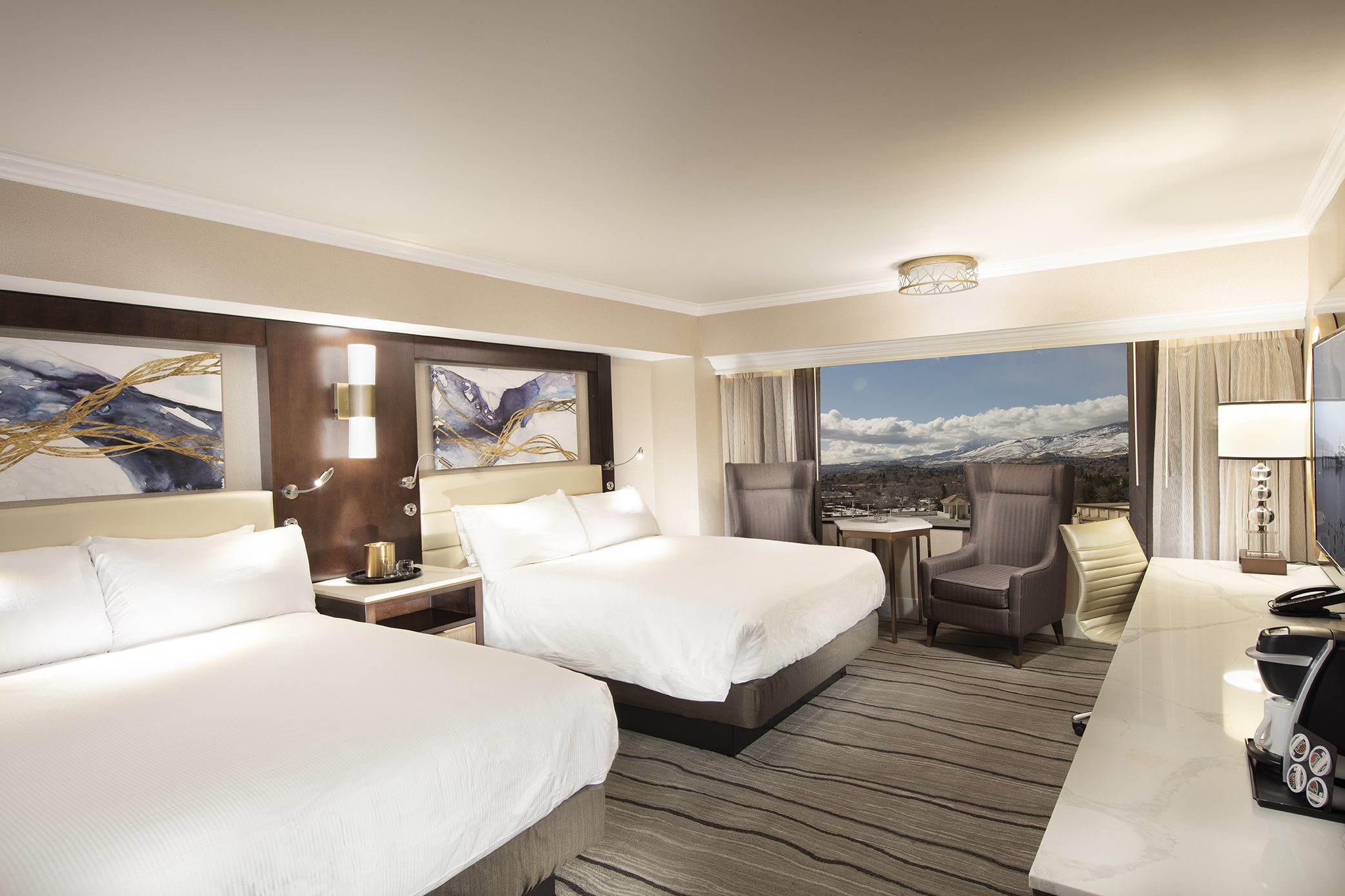 Peppermill’s newly-remodeled Deluxe Two Queen Rooms feature innovative amenities paired with posh design. Airy quartz countertops set against luxe dark birch furnishings create a bold foundation for the room’s stylish, contemporary artwork and accented designer carpeting. Upon arrival you’ll be greeted with panoramic city or mountain views in your elegantly appointed room. Stay in these spacious rooms and see why Peppermill is voted Reno’s best hotel year after year.
