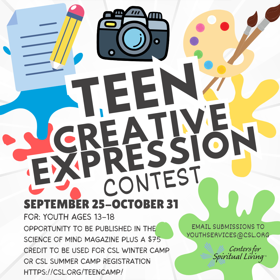 Are you a teen with a creative spark? This contest invites youth ages 13–18 to express themselves through original writing, visual art, or photography. Whether it’s a powerful poem, a striking painting, or a photo that tells a story, we want to see how you view the world. Selected entries will be recognized for creativity, originality, and impact—with an opportunity to be published in the Science of Mind Magazine plus a $75 credit to be used for CSL Winter Camp or CSL Summer Camp registration. Let your voice be seen, heard, and felt! Please email your submission to hsharp@csl.org and youthservices@csl.org by Friday, October 31, 2025. Please send any questions to youthservices@csl.org.